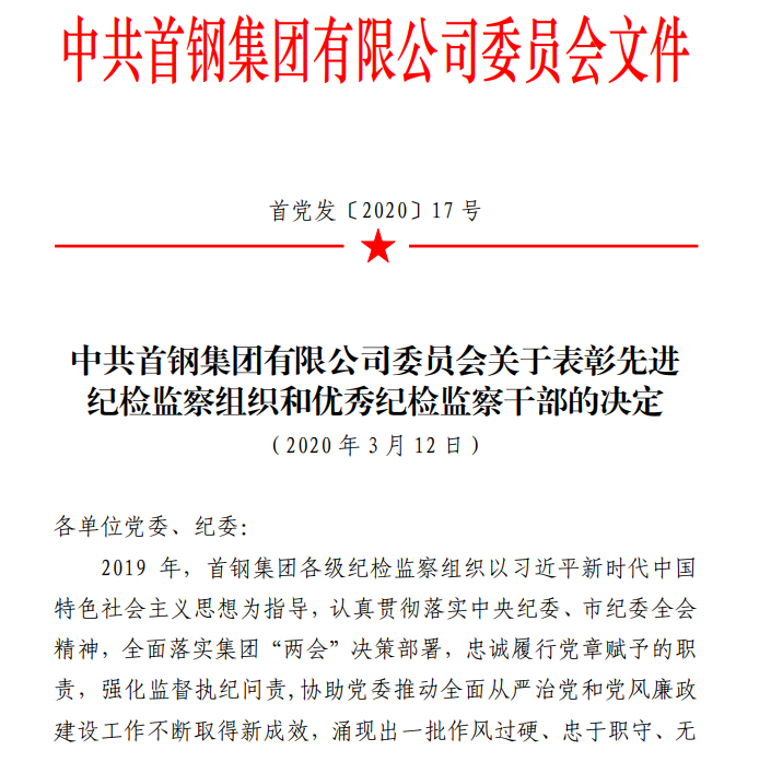 首钢表彰先进纪检监察组织和优秀纪检监察干部 水钢榜上有名 | (2020-03-30 00) |