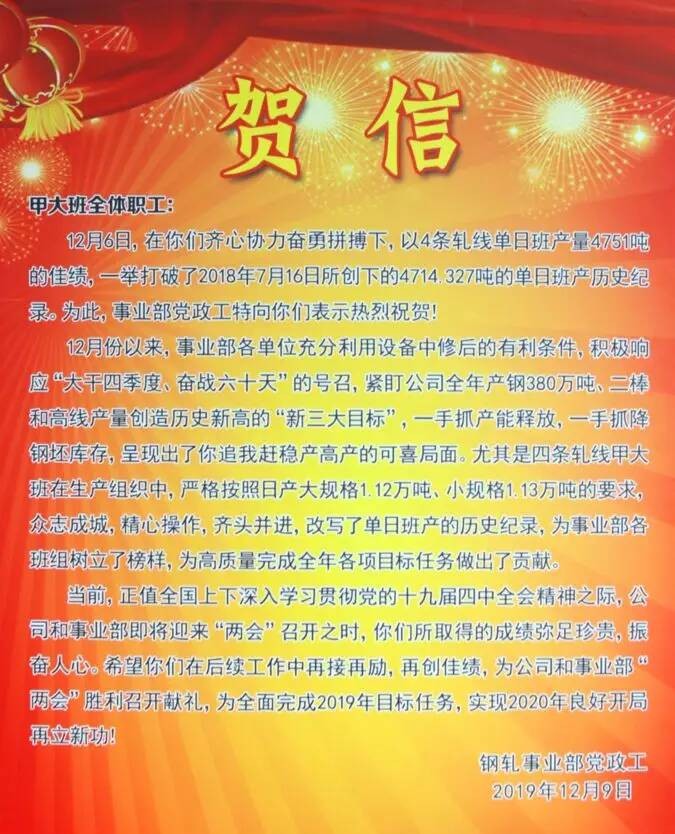 钢轧事业部轧线再创班产新纪录 | (2019-12-11 20) |